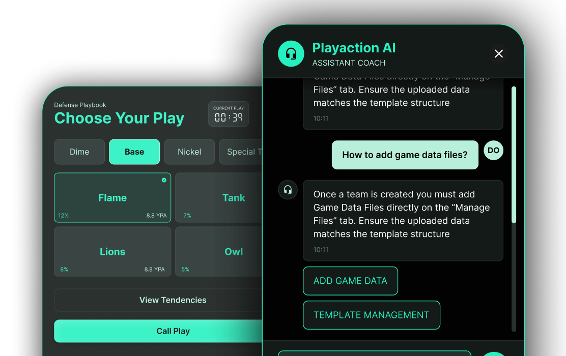 Through our proprietary blend of advanced analytics and AI-generated scenarios, coaching staffs can sharpen their instincts, master playcalling, and elevate team communication. From NFL sidelines to college stadiums and high school fields, PlayAction empowers coaches to make lightning-fast, data-backed decisions when championships are on the line.